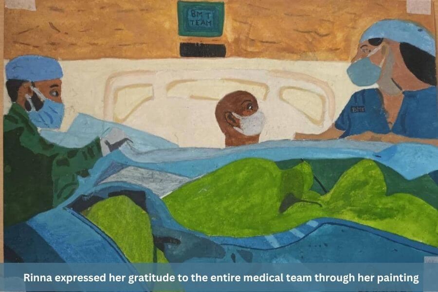 Her love for art remained intact. During this 100-day period, she created a piece of art highlighting her gratitude and appreciation for all the people who, directly or indirectly, intimately contributed to the new her. This painting now adorns the wall of Dr. Gaurav's office. It expresses her courage, shared with all the other children who, like her, will find themselves in Dr. Gaurav's office for the same treatment process.